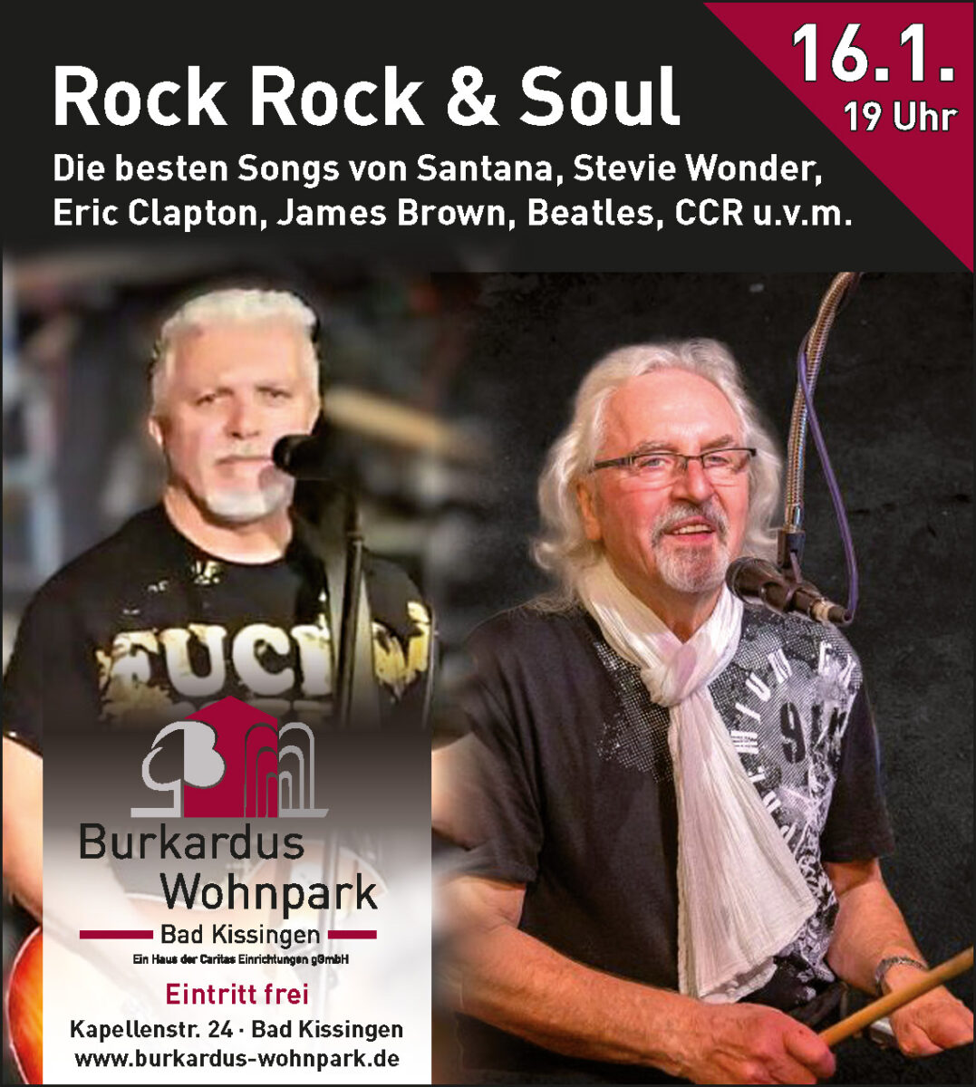 Freitag, 16. Januar 2026, 19 Uhr (Einlass 18 Uhr) Rockrocksoul – das sind Jaxx Vintage und Paul Purkert. Die beiden Vollblutmusiker präsentieren die besten Songs der Rock- und Soulmusik z. B. von Carlos Santana, George Benson, Stevie Wonder, Eric Clapton, James Brown, Beatles, CCR und vielen mehr...